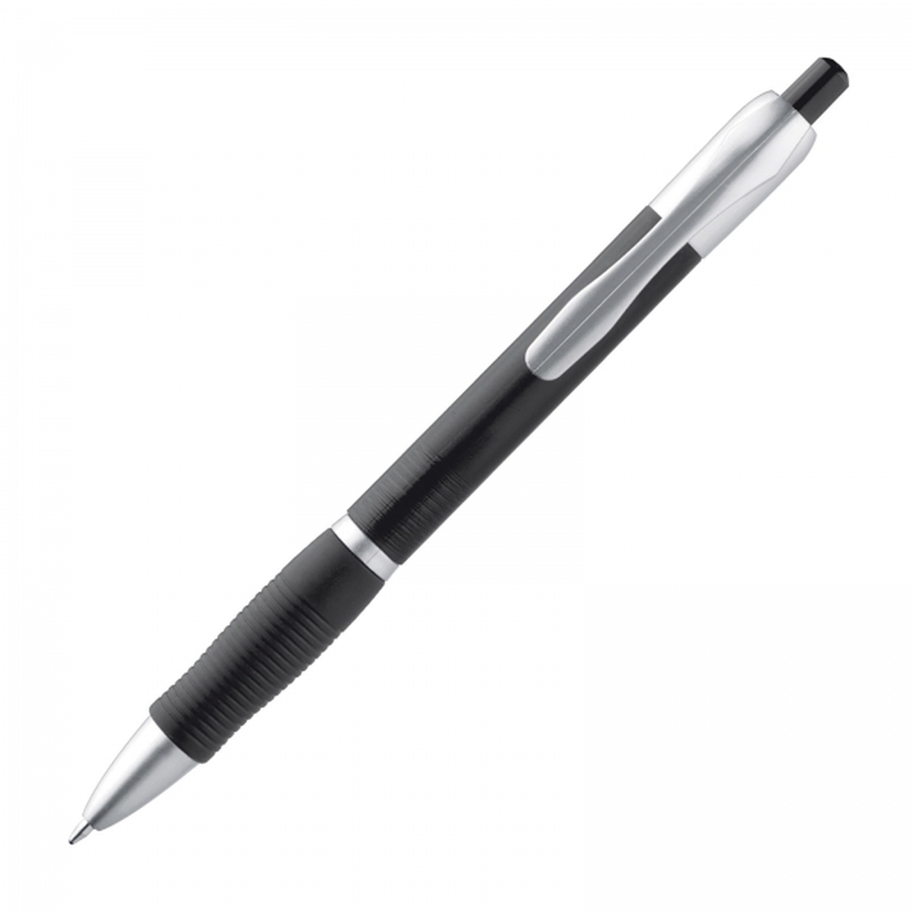 Plastikowy, transparentny długopis z niebieskim wkładem i gumową strefą chwytu. Kolorowy korpus ozdobiono srebrnymi elementami.
