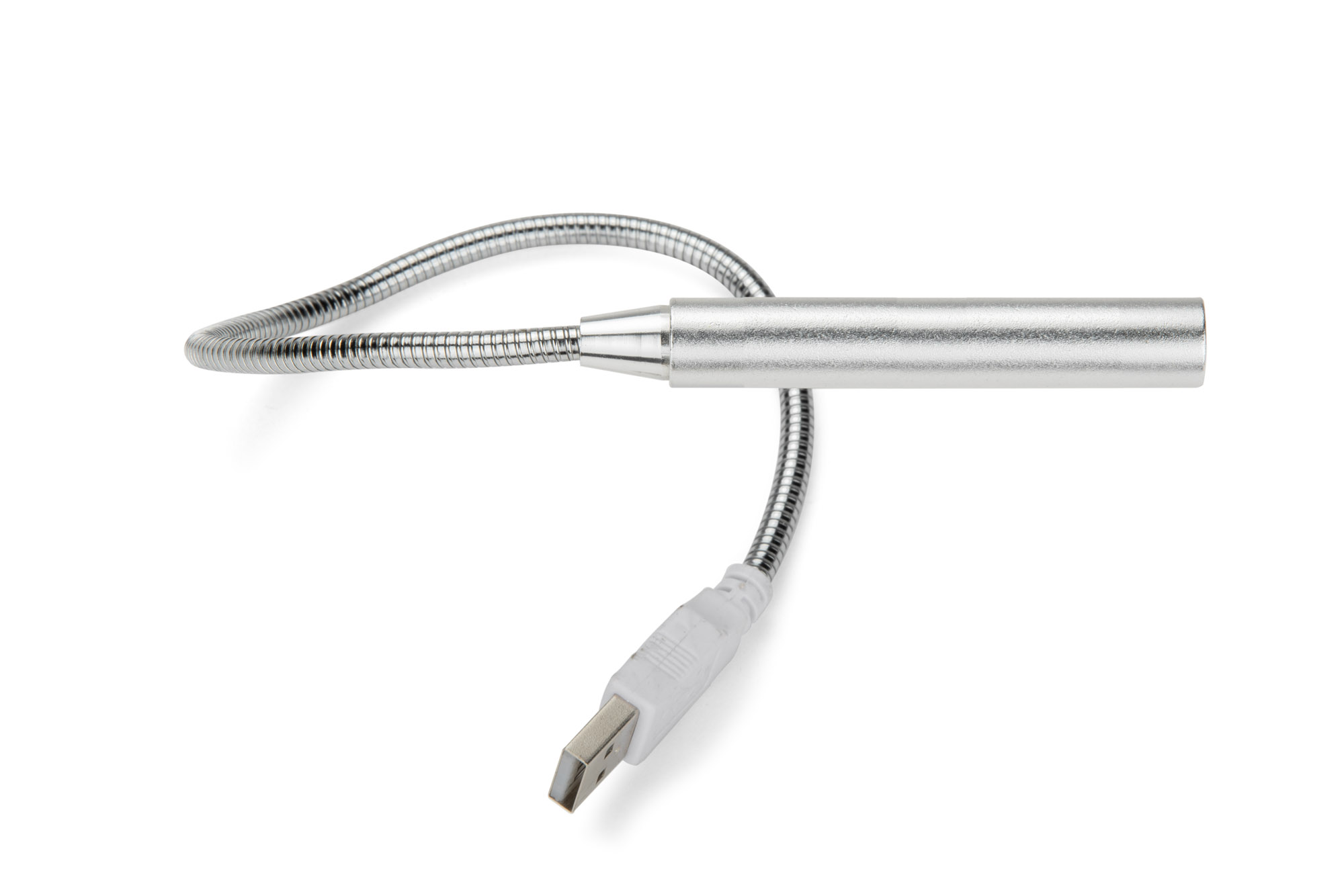 Lampka wykonana z metalu zasilana energią z portu USB, np. z laptopa lub power banka. Posiada elastyczny pałąk pozwalający na precyzyjne ustawienie lampki oraz 6 diod LED.
