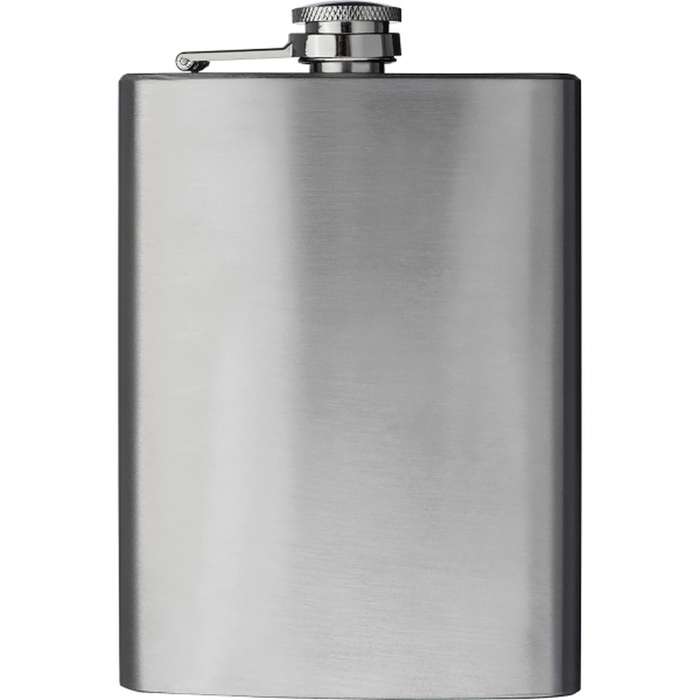 Piersiówka ze stali nierdzewnej z bezpiecznym zamknięciem, pojemność 237 ml.